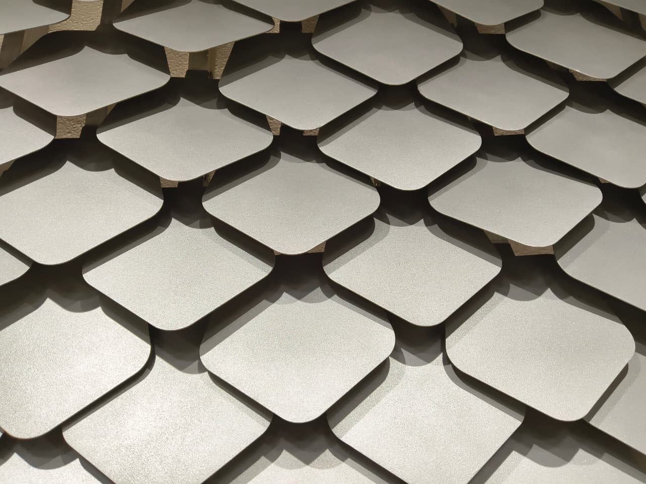 Overlapping, tile-like metal plates creating a textured, multi-layered facade surface.