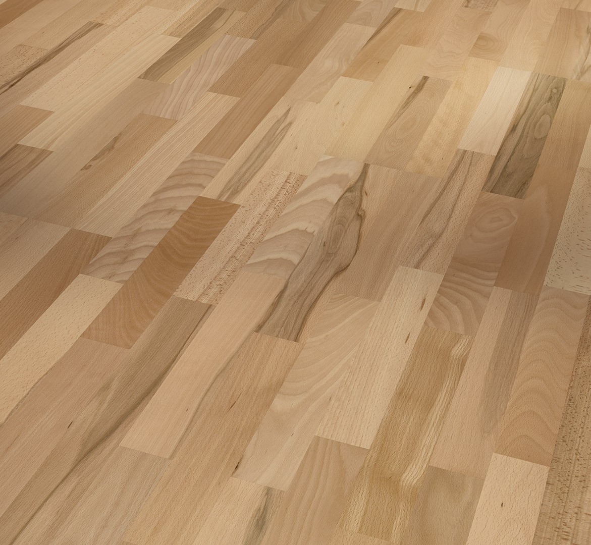 Parador engineered wood flooring Beech 3-strip from the Basic 11-5 product line is an attractive engineered wood flooring with a top layer of solid wood in matt lacquer, which enables price-conscious interior design with individual and high-quality engineered wood flooring. Suitable for everyday use and easy to maintain, this convincing natural product offers a wide range of design options. This Parador engineered wood flooring from the Basic 11-5 product line is available as a 3-strip in the format 2200 x 185 x 11.5 mm. Its design with no bevel ensures a closed and uniform installation pattern. The Rustikal assortment, due to its knotty appearance, the pronounced play of colours and its distinct grain, appears particularly original. Parador engineered wood flooring Basic 11-5 has an Automatic-Click system and is easy to install – also thanks to the low installation height of 11.5 mm. The top layer is about 2.5 mm high. The engineered wood flooring is even suitable for installation on underfloor heating systems. This flooring has reliable swelling protection due to an all-round lamella and top layer impregnation. A manufacturer’s guarantee period of ten years is granted.