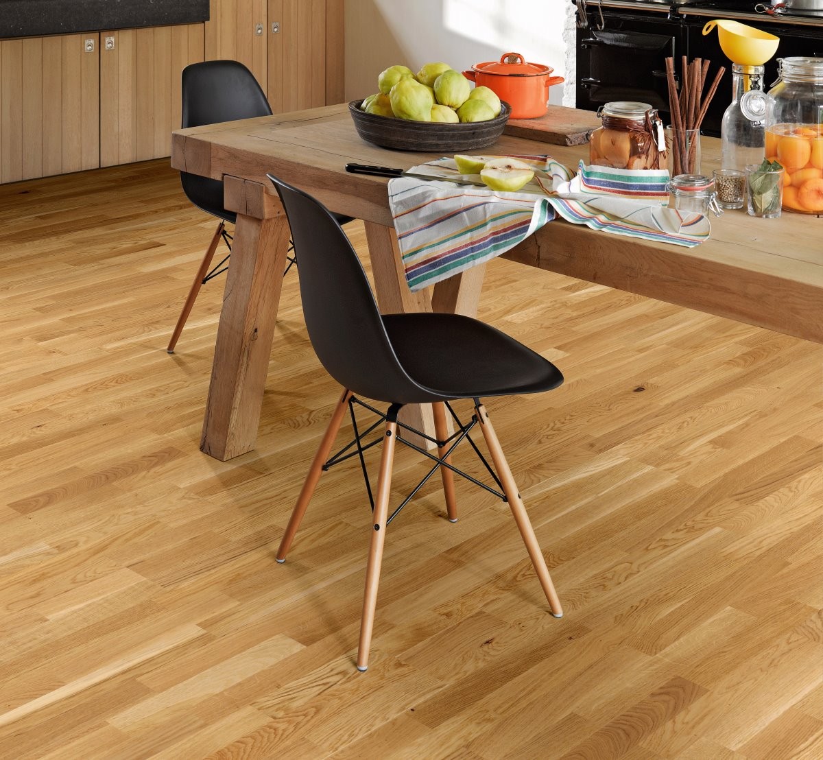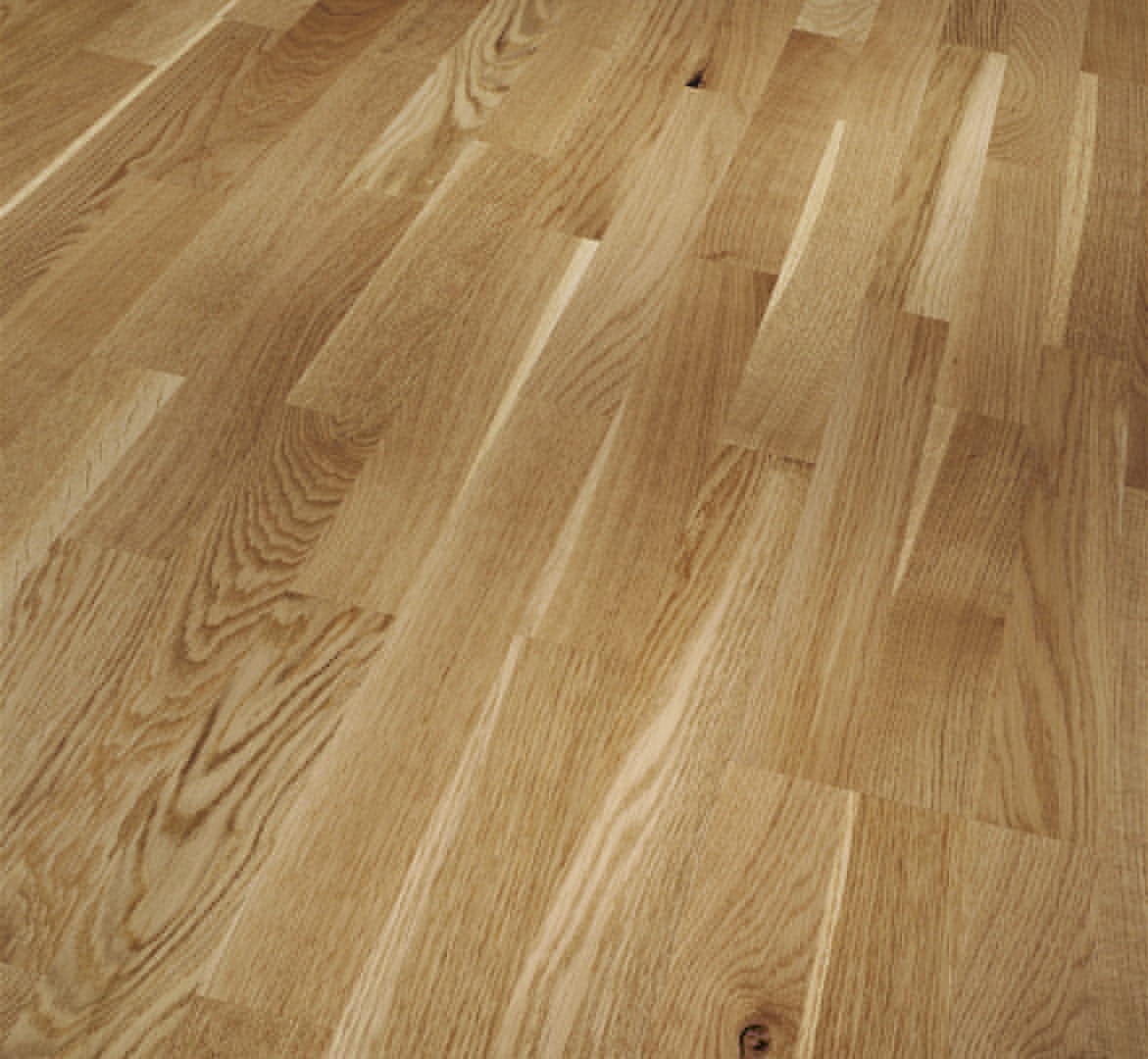 Parador engineered wood flooring Oak 3-strip from the Classic 3060 product line meets the highest demands in terms of design and quality and can satisfy a wide range of design requirements. The high-quality engineered wood flooring has a matt lacquer finish and creates a very special and natural atmosphere for any living room ambience. The planks of uncompromising quality are available as a 3-strip in the format 2200 x 185 x 13 mm. The Living assortment is characterised by vibrant looks and stresses the earthy character of the wood. The design of the planks has no bevels, so that the planks join together without any noticeable gaps, creating a uniform and harmonious installation pattern. Durable and stylish in installation, Parador Classic 3060 engineered wood flooring is easy to install thanks to an Automatic-Click system with long and end edge locking. The all-round impregnation of the lamellas and top layers ensures reliable swelling protection. The top layer is about 3.6 mm high. This engineered wood flooring is suitable for installation on underfloor heating systems. The manufacturer’s guarantee is 25 years. For the production of Parador engineered wood flooring from the Classic 3060 product line, wood from sustainably managed sources is predominantly used. Parador engineered wood flooring has received several certifications.