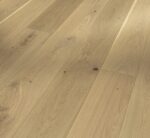 Parador engineered wood flooring Oak wide plank from the Basic 11-5 product line is an attractive engineered wood flooring with a top layer of solid wood in white matt lacquer, which enables price-conscious interior design with individual and high-quality engineered wood flooring. Suitable for everyday use and easy to maintain, this convincing natural product offers a wide range of design options. This Parador engineered wood flooring from the Basic 11-5 product line is available as a wide plank in the format 2200 x 185 x 11.5 mm. The planks have an all-round mini bevel, which discreetly interrupts the appearance of the installed planks and underlines the typical engineered wood flooring look. The Rustikal assortment, due to its knotty appearance, the pronounced play of colours and its distinct grain, appears particularly original. Parador engineered wood flooring Basic 11-5 has an Automatic-Click system and is easy to install – also thanks to the low installation height of 11.5 mm. The top layer is about 2.5 mm high. The engineered wood flooring is even suitable for installation on underfloor heating systems. This flooring has reliable swelling protection due to an all-round lamella and top layer impregnation. A manufacturer’s guarantee period of ten years is granted.