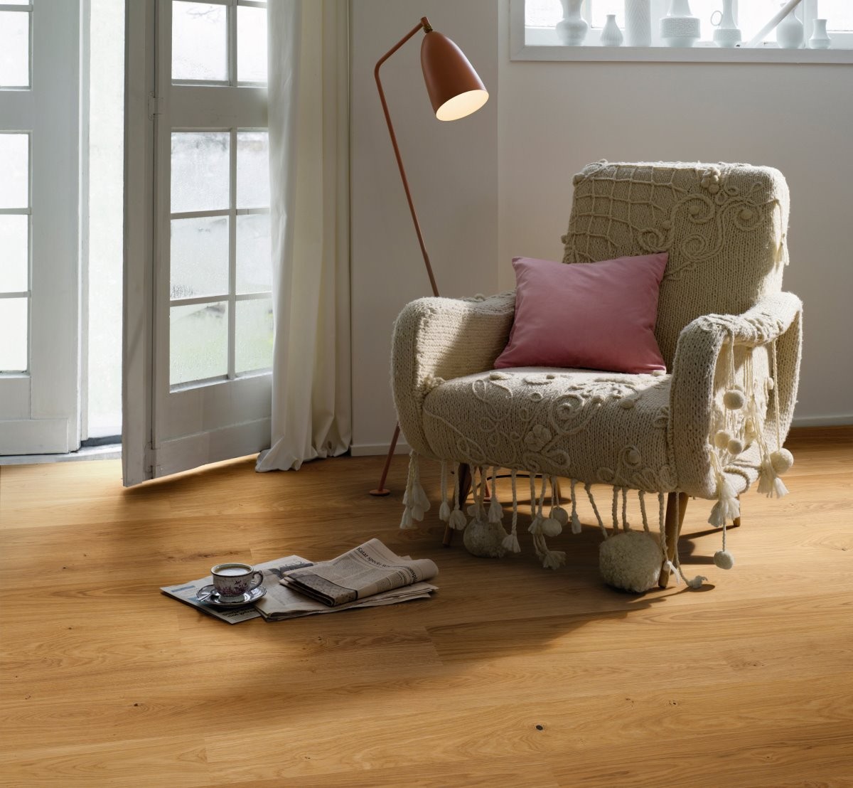 Parador engineered wood flooring Oak wide plank from the Basic 11-5 product line is an attractive engineered wood flooring with a top layer of solid wood in natural oil, which enables price-conscious interior design with individual and high-quality engineered wood flooring. Suitable for everyday use and easy to maintain, this convincing natural product offers a wide range of design options. This Parador engineered wood flooring from the Basic 11-5 product line is available as a wide plank in the format 2200 x 185 x 11.5 mm. The planks have an all-round mini bevel, which discreetly interrupts the appearance of the installed planks and underlines the typical engineered wood flooring look. The Classic assortment boasts a vibrant range between a harmonious, natural and earthy look. Parador engineered wood flooring Basic 11-5 has an Automatic-Click system and is easy to install – also thanks to the low installation height of 11.5 mm. The top layer is about 2.5 mm high. The engineered wood flooring is even suitable for installation on underfloor heating systems. This flooring has reliable swelling protection due to an all-round lamella and top layer impregnation. A manufacturer’s guarantee period of ten years is granted.