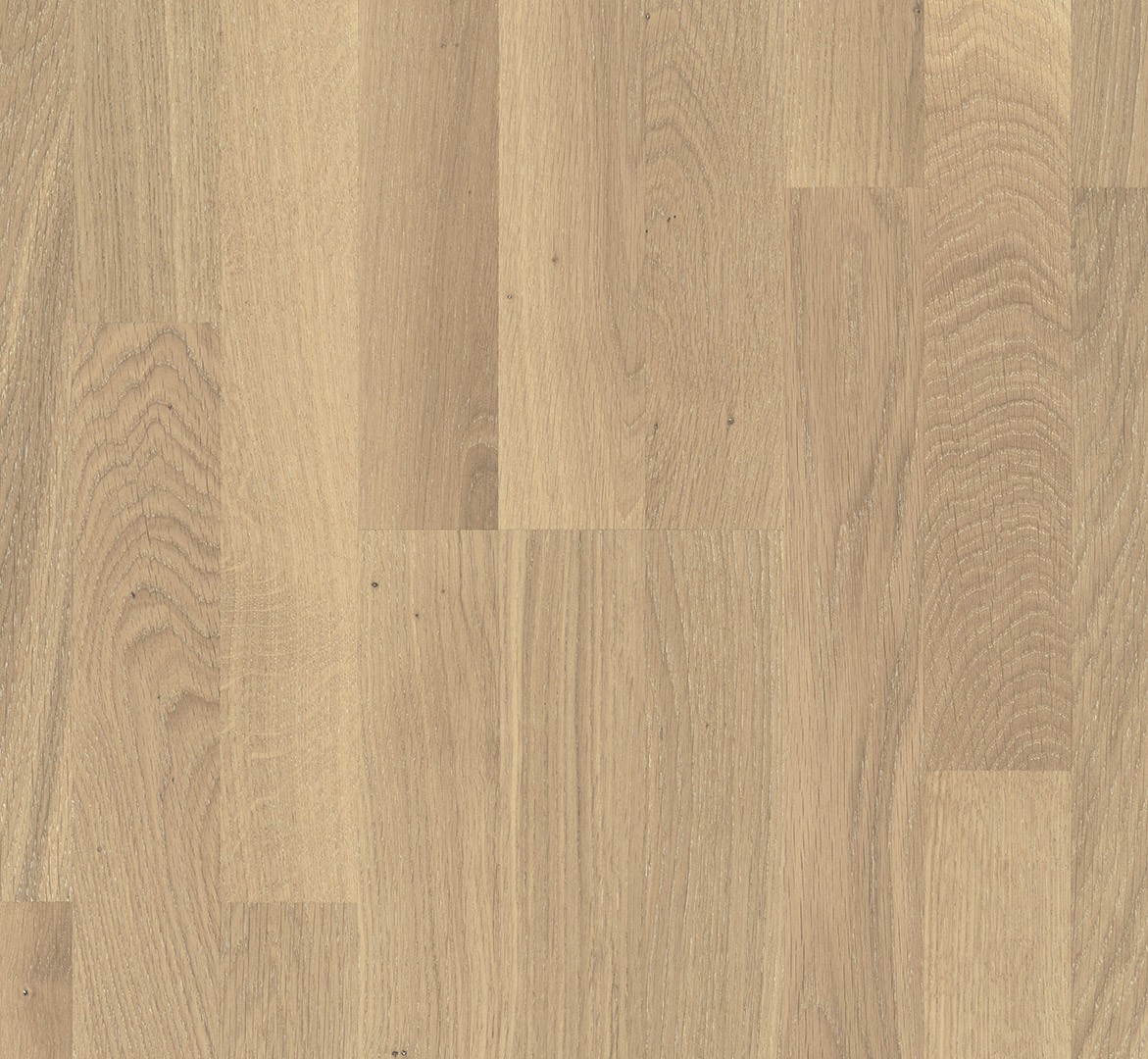 Parador engineered wood flooring Oak 3-strip from the Classic 3060 product line meets the highest demands in terms of design and quality and can satisfy a wide range of design requirements. The high-quality engineered wood flooring has a white matt lacquer finish and creates a very special and natural atmosphere for any living room ambience. The planks of uncompromising quality are available as a 3-strip in the format 2200 x 185 x 13 mm. The Living assortment is characterised by vibrant looks and stresses the earthy character of the wood. The design of the planks has no bevels, so that the planks join together without any noticeable gaps, creating a uniform and harmonious installation pattern. Durable and stylish in installation, Parador Classic 3060 engineered wood flooring is easy to install thanks to an Automatic-Click system with long and end edge locking. The all-round impregnation of the lamellas and top layers ensures reliable swelling protection. The top layer is about 3.6 mm high. This engineered wood flooring is suitable for installation on underfloor heating systems. The manufacturer’s guarantee is 25 years. For the production of Parador engineered wood flooring from the Classic 3060 product line, wood from sustainably managed sources is predominantly used. Parador engineered wood flooring has received several certifications.