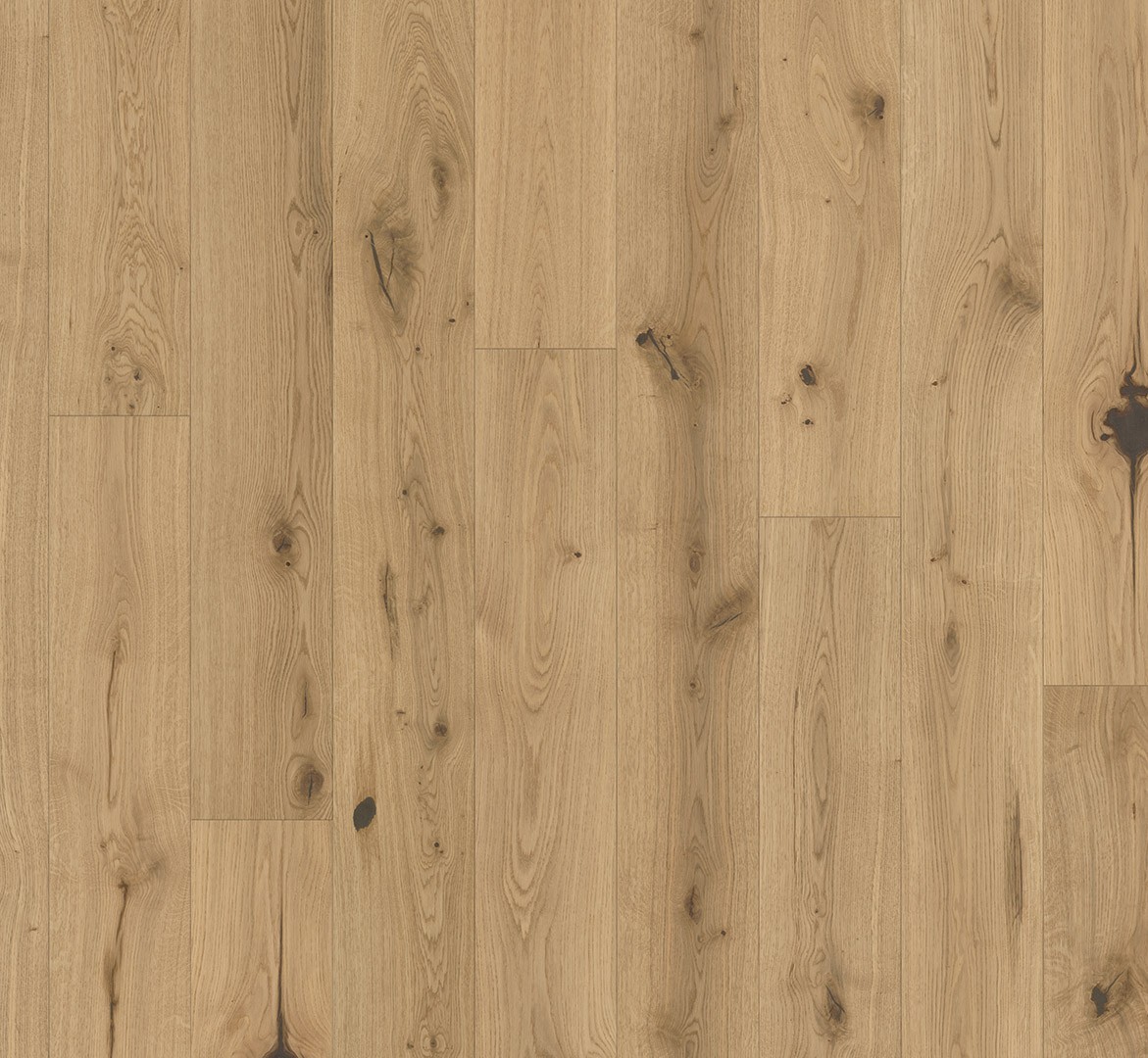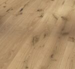 Parador engineered wood flooring Oak Chianti light-whitewashed wide plank from the Basic 11-5 product line is an attractive engineered wood flooring with a top layer of solid wood in white matt lacquer, which enables price-conscious interior design with individual and high-quality engineered wood flooring. Suitable for everyday use and easy to maintain, this convincing natural product offers a wide range of design options. This Parador engineered wood flooring from the Basic 11-5 product line is available as an wide plank in the format 2200 x 185 x11,5 mm. A 4-sided mini bevel discreetly interrupts the appearance of the installed planks and thus underlines the original character of engineered wood flooring. The Character assortment has an original, rustic wood appearance with larger knots and striking differences in colour and texture. Parador engineered wood flooring Basic 11-5 has an Automatic-Click system and is easy to install – also thanks to the low installation height of 11.5 mm. The top layer is about 2.5 mm high. The engineered wood flooring is even suitable for installation on underfloor heating systems. This flooring has reliable swelling protection due to an all-round lamella and top layer impregnation. A manufacturer’s guarantee period of ten years is granted.