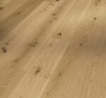 Parador engineered wood flooring Oak Lugana natural wide plank from the Trendtime 4 product line enables trendy interior design at the highest level. The sophisticated design as well as the natural oil plus surface of the wide planks in the format 2010 x 160 x 13 mm make this engineered wood flooring a real all-rounder in the field of unique living space design. The Rustikal assortment, due to its knotty appearance, the pronounced play of colours and its distinct grain, appears particularly original. A 4-sided mini bevel discreetly interrupts the appearance of the installed planks and thus underlines the original character of engineered wood flooring. The planks can be installed very easily thanks to an Automatic-Click system with long and end edge locking. An all-round lamella and top layer impregnation provides reliable swelling protection. The height of the solid wood top layer is approx. 3.6 mm. The flooring remains dimensionally stable and gives a pleasant walking sensation that is warm underfoot. Parador engineered wood flooring Trendtime 4 is suitable for installation on underfloor heating systems. The manufacturer’s guarantee on this engineered wood flooring is 25 years. For the production of Parador engineered wood flooring from the Trendtime product line, wood from sustainably managed sources is predominantly used. Parador engineered wood flooring has received several certifications.