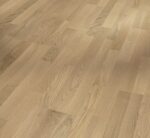 Parador engineered wood flooring Oak Sauvignon light-whitewashed 3-strip from the Classic 3060 product line meets the highest demands in terms of design and quality and can satisfy a wide range of design requirements. The high-quality engineered wood flooring has a white matt lacquer finish and creates a very special and natural atmosphere for any living room ambience. The planks of uncompromising quality are available as a 3-strip in the format 2200 x 185 x 13 mm. The Natur assortment is the best basis for achieving a natural and original overall effect. The design of the planks has no bevels, so that the planks join together without any noticeable gaps, creating a uniform and harmonious installation pattern. Durable and stylish in installation, Parador Classic 3060 engineered wood flooring is easy to install thanks to an Automatic-Click system with long and end edge locking. The all-round impregnation of the lamellas and top layers ensures reliable swelling protection. The top layer is about 3.6 mm high. This engineered wood flooring is suitable for installation on underfloor heating systems. The manufacturer’s guarantee is 25 years. For the production of Parador engineered wood flooring from the Classic 3060 product line, wood from sustainably managed sources is predominantly used. Parador engineered wood flooring has received several certifications.