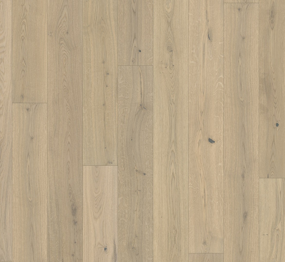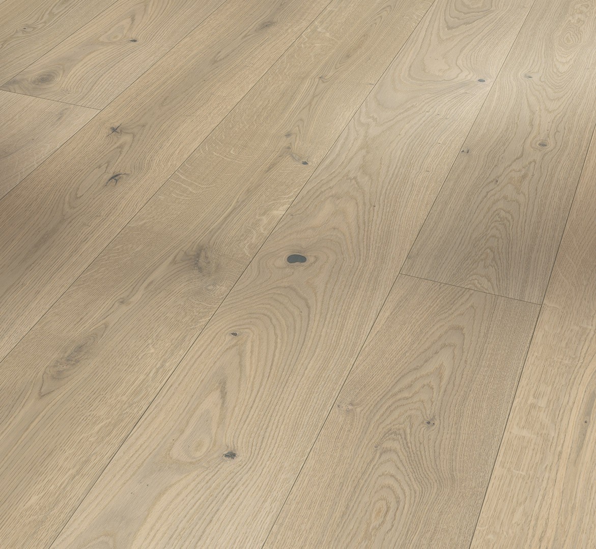 Parador engineered wood flooring Oak Soave white wide plank from the Classic 3060 product line meets the highest demands in terms of design and quality and can satisfy a wide range of design requirements. The high-quality engineered wood flooring has a white matt lacquer finish and creates a very special and natural atmosphere for any living room ambience. The planks of uncompromising quality are available as a wide plank in the format 2200 x 185 x 13 mm. The Living Plus assortment is characterised by a vibrant look and attributes of earthy wood without sapwood. A 4-sided mini bevel discreetly interrupts the appearance of the installed planks and thus underlines the original character of engineered wood flooring. Durable and stylish in installation, Parador Classic 3060 engineered wood flooring is easy to install thanks to an Automatic-Click system with long and end edge locking. The all-round impregnation of the lamellas and top layers ensures reliable swelling protection. The top layer is about 3.6 mm high. This engineered wood flooring is suitable for installation on underfloor heating systems. The manufacturer’s guarantee is 25 years. For the production of Parador engineered wood flooring from the Classic 3060 product line, wood from sustainably managed sources is predominantly used. Parador engineered wood flooring has received several certifications.